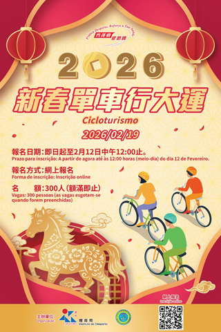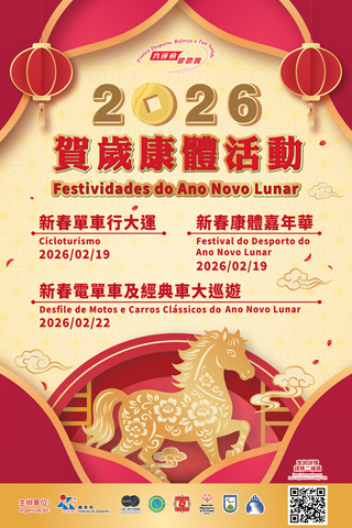 【特訊】為喜迎甲午馬年的來臨,體育局將於農曆正月初三(2月19日)及初六(2月22日)深入社區舉辦「2026賀歲康體活動」,系列活動包括「新春單車行大運」、「新春康體嘉年華」及「新春電單車及經典車大巡遊」,歡迎全澳市民及旅客踴躍參與。活動內容豐富,尤其適合家庭親子同樂,讓大家在歡度佳節的同時,也能透過多元化的康體活動鍛鍊身心。