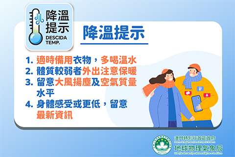 隨著冬季季風抵達華南沿岸,氣象局預料本澳今、明氣溫顯著下降,低見攝氏十度。北風增強,雲量增多,展望本周中期天氣寒冷及乾燥,周末期間氣溫略為回升。除呼籲市民及時添衣外,亦建議公眾注意,氣溫驟降容易引發身體不適(例如呼吸道、關節、心臟、腸胃等),有需要可戴口罩,多喝溫水,並針對身體不同部位重點保暖。