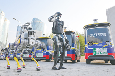 ◎ 一月二十二日,警用四足機器人、人形機器人、無人巡邏車集中展示。當日,浙江杭州濱江公安投用十一輛具備全景感知、邊緣計算、自動識別功能的無人巡邏車,當地依託無人巡邏車、人形機器人、四足機器人、無人機等科技裝備形成的智能巡防系統實現全域、常態化運行。(中新社記者 王剛 攝)