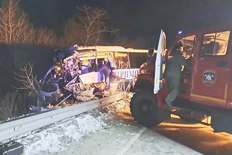 ◎ 俄羅斯濱海邊疆區一月二十二日發生大巴與貨車相撞事故,造成三人死亡,八人受傷。無中國公民傷亡。據符拉迪沃斯托克新聞網報道,事故發生在濱海邊疆區哈桑區的一條公路上。事發時,貨車失去控制,駛入對向車道,造成兩車相撞。大巴上共有十四人,事故造成大巴司機和兩名乘客死亡,車上另外八人受傷。中國駐符拉迪沃斯托克總領事館確認,無中國公民在這起事故中傷亡。圖為當日在俄羅斯遠東濱海邊疆區哈桑區拍攝的交通事故現場。(新華社發 俄羅斯濱海邊疆區哈桑區政府供圖)
