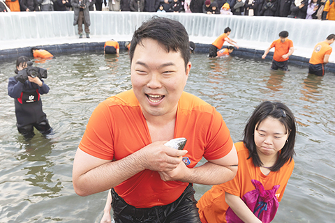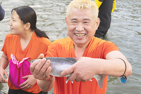 近日,韓國華川舉行山鱒魚慶典。遊客可以體驗冰上垂釣和徒手抓魚等活動。