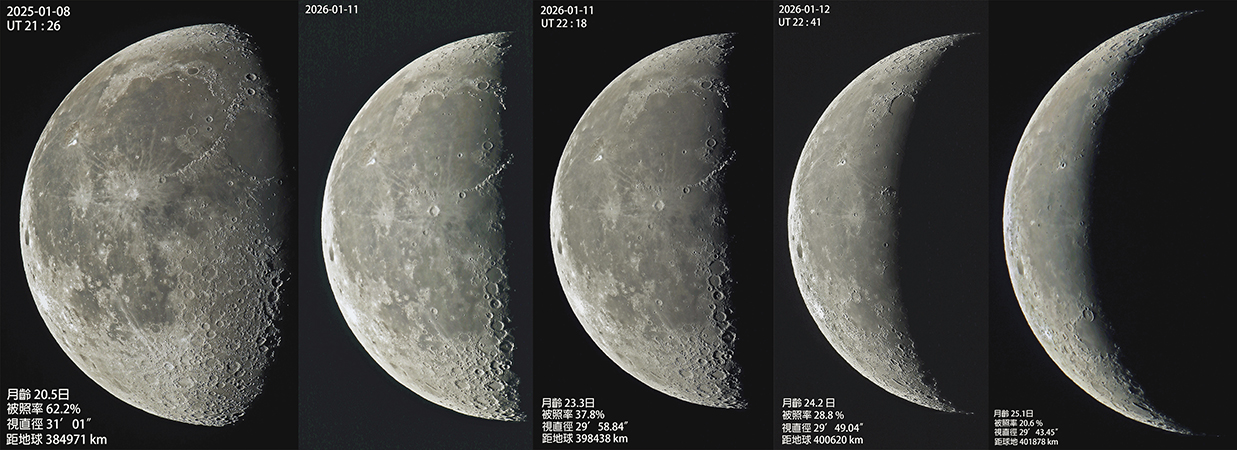 二月天象 高清太陽黑子影像 意大利上空的紅色精靈 與圓形精靈閃電 極光冕 朱諾號拍攝的 木星雲層高畫質影像 天使星雲 木星大衝 下弦月後之月相 今年最大滿月 下弦月後之月相 2026-01-26 03:30:00 難得一踏入二零二六年的天色持續晴朗,才可以拍到下弦月後的連續月相變化過程。然而由於月相是出現在日出前,所以,要大清早的日出前拍攝,由於這段日子剛好是寒流襲澳,要頂著寒風拍攝,這些影像得來不易呢。 Takahashi FC-N 100 F/9 With Hyper Sharp 1.8x Barlow;Camera Alfred Lee◇