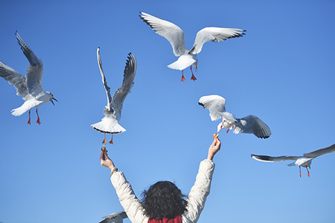 ◎ 一月二十五日,一名遊客喂紅嘴鷗。當日,雲南昆明陽光和煦,眾多遊客在海埂大壩觀鷗、喂鷗。(中新社記者 黃興鴻 攝)