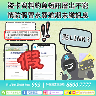 【特訊】司警局於近日發現有騙徒向市民發送附有連結的詐騙短訊,訛稱市民「有一筆已逾期未繳的水費」,點擊有關連結後將會進入一個假冒澳門自來水股份有限公司的網頁,並顯示有「水費催繳通知書」字樣,以此誘騙市民輸入信用卡資料、一次性交易驗證碼以進行未經授權之大額交易。