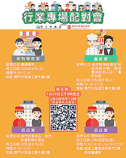 二月六日全日舉辦「澳娛綜合度假股份有限公司」專場配對會,提供二十七個職位空缺,涉及餐廳助理經理(中餐/日本餐/娛樂場餐飲)、助理禮賓司、公共區域主任、前台服務員、禮賓大使及餐飲服務員等崗位。