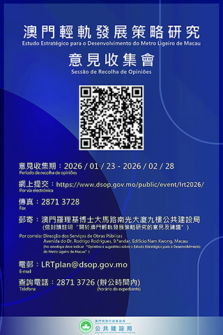 另外,第二場公眾意見收集會將於二月八日舉行,有意參加的市民可透過專題網頁(https://www.dsop.gov.mo/public/event/lrt2026/)報名及下載路線藍圖介紹文本,亦可透過專題網頁填寫意見表,或以郵寄、傳真、電郵、電話等方式提出寶貴意見。如有疑問,可於辦公時間致電二八七一 三七二六查詢。◇