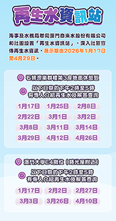 二月期間,海事及水務局及澳門自來水股份有限公司將繼續於指定日期的下午二時至五時,派出專員駐場解答居民查詢,並聽取居民意見。其中,設於澳門大學E4劉少榮樓的「再生水資訊站」專員駐場日期為二月二日及二十七日;設於石排灣樂群樓第三座休憩區的「再生水資訊站」專員駐場日期則為二月八日及二十二日。現場設有互動遊戲及資訊展板,歡迎居民到場參觀了解再生水資訊。詳情可瀏覽海事及水務局網站www.marine.gov.mo。