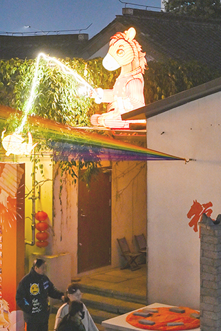 ◎ 二月九日,江蘇南京,城南馬道街附近小巷內建築頂部佈置的馬年彩燈亮起。(中新社記者泱波 攝)