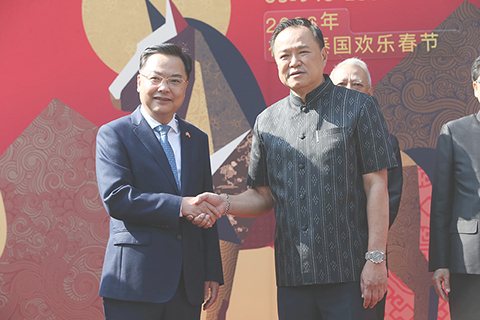 ◎ 泰國看守總理阿努廷二月十日在參加「歡樂春節」走進泰國總理府活動時用中文送上馬年祝福。圖為當日,在位於泰國曼谷的總理府,泰國看守總理阿努廷(右)在活動上與中國駐泰國大使張建衛握手。(新華社發 拉亨 攝)