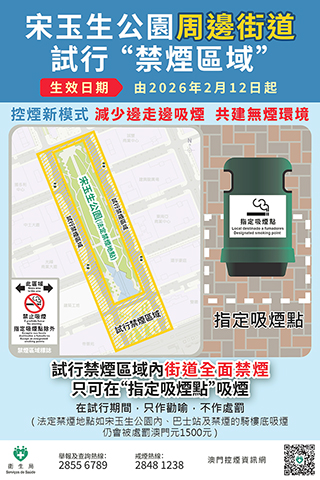 【特訊】特區政府貫徹落實《健康澳門藍圖》中降低煙草使用率的目標,以立法、執法、教育宣傳及鼓勵戒煙等多管齊下策略執行各項控煙政策和措施。為保障行人健康,減少邊走邊吸煙的行為,今(十二)日起於宋玉生公園周邊街道試行「禁煙區域」,除「指定吸煙點」外,「禁煙區域」內禁止吸煙。