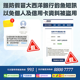 【特訊】司法警察局昨日發現有騙徒假冒澳門大西洋銀行的名義,隨機向市民濫發釣魚短訊。內容訛稱豁免用戶信用卡年費,誘導市民點擊短訊內附帶的釣魚連結以申請退還款項一千二百澳門元。若市民點擊該連結,將會進入一個假冒「大西洋銀行」的釣魚網站。該網站會要求市民填寫姓名、手機號碼,並要求輸入信用卡號碼、有效期限及安全碼等資料進行驗證。一旦騙徒成功盜取相關資料後,便會利用這些資料進行未經授權的大額交易。