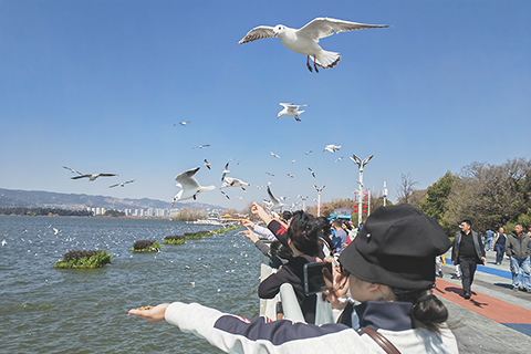 ◎ 二月十六日,遊客在雲南省昆明市海埂大壩餵食紅嘴鷗。除夕當天,許多遊客和市民來到雲南省昆明市海埂大壩,觀賞越冬的紅嘴鷗。(新華社記者 浦超 攝)