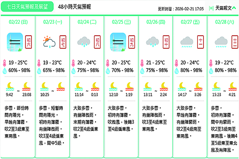 預測今日多雲,部份時間有陽光。早晚有薄霧。吹二至三級東至東南風。氣溫約為攝氏十九至廿五度。相對濕度介乎百分之六十至九十八之間。預測最高紫外線指數約為七,級別屬於高。◇