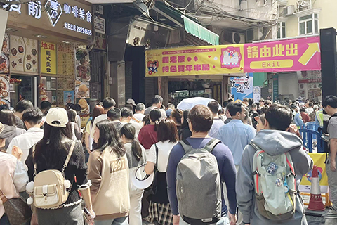 據旅遊局春節黃金周統計數據顯示,內地春節假期首天訪澳旅客共錄得近廿萬人次,昨日是大年初五,大三巴一帶仍然人頭湧湧,有區內商戶反映,新春人流持續暢旺,生意亦有所增長。昨日大三巴街兩度實施人潮管制,行人只可單向上行前往牌坊,並取道大關斜巷、關前後街、高園街等街巷離開,這已是大三巴連續第五日實施人潮管制,有旅客指理解分流措施,同時亦可遊覽大三巴周邊小巷風情,另有一番風味。