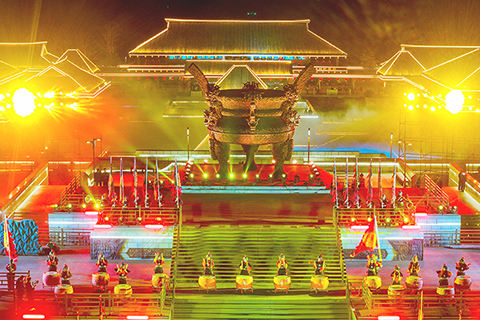 ◎這是二月廿一日拍攝的「荊州十二時辰.楚樂八百年」演出現場(無人機照片)。當日,大型文旅項目「荊州十二時辰.楚樂八百年」在湖北省荊州市首演。該項目以沉浸式劇情為核心串起大戲、雅樂、非遺、互動等多元內容,融入楚舞、楚樂、楚辭、楚劍等文化內核,再現楚國八百年輝煌歷史。新華社發(張夢瑤 攝)