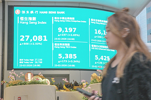 【香港中通社2月23日電】(記者 譚暢)美國最高法院駁回特朗普的關稅政策,港股23日顯著上升,重越兩萬七點關口。恆生指數全日升668點或2.5%,報27081點。大市全日成交額約為1729.6億港元。