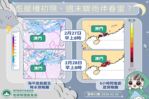 踏入初春,華南地區開始出現低壓槽。預料周末期間(二十七至二十八日)一道低壓槽將影響廣東沿岸,本澳間中有驟雨,更可能出現本年首次雷暴。氣象局呼籲市民留意該局最新天氣資訊,外出帶備雨具,適時調整出行計劃。