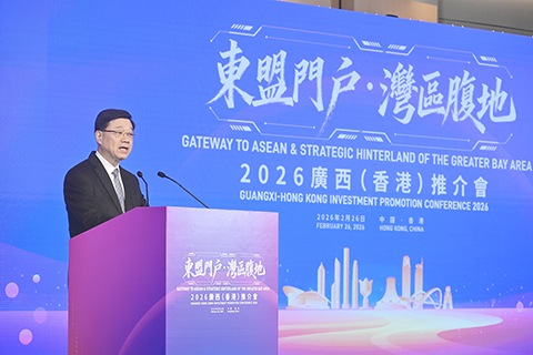 香港新一份財政預算案財赤止血派糖惠民且加甜 今財年度任務造血押注AI投資未來 李家超禮賓府與廣西壯族自治區黨委書記陳剛會面 李家超:預算案創新務實惠民生 港政商界認同預算案舉措 匯控查佈業績後股價漲逾百分五 港股升一七五點 香港今年一月份通脹率 放緩至百分一點一 女警在警署疑自轟亡 經營賬目提前恢復盈餘惟仍發債投資基建 陳茂波料今年經濟增長百分二點五至三點五 港推出百億創科基金 培育新興產業 將投放卅億元 推動文旅產業發展 煽惑他人在立法會選舉不投票 港女子認罪判囚緩刑 李家超推介會上致辭 2026-02-27 03:30:00 ◎ 二月廿六日,香港特區行政長官李家超在「東盟門戶‧灣區腹地─二0二六廣西(香港)推介會」致辭。(香港中通社圖片)