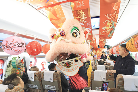 ◎ 三月一日,列車工作人員在G一二八0次列車上表演舞獅。元宵節來臨之際,中國鐵路哈爾濱局集團有限公司齊齊哈爾客運段擔當的齊齊哈爾南開往天津西的G一二八0次列車上舉行「鬧元宵·話團圓」主題活動,車廂內張燈結綵,民族歌舞、舞獅、變臉等節目接連上演,讓旅途充滿節日溫情。(新華社發 徐率攝)
