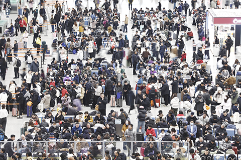 三月三日,記者從中國國家鐵路集團有限公司獲悉,截至三月二日,全國鐵路二O二六年春運累計發送旅客點零七億人次。圖為三月二日,旅客在鐵路上海虹橋站等待出行。◇(中新社記者 殷立勤 攝)