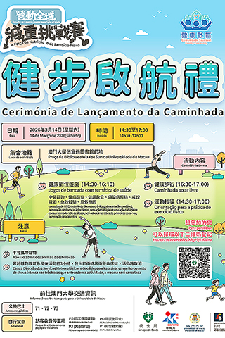 衛生局與體育局聯同澳門大學將於3月14日(星期六)下午2時半至5時在澳門大學伍宜孫圖書館前地舉辦「營動全城」減重挑戰賽—健步啟航禮。活動當天將於澳門大學校園內共同步行約2.5公里路段,寓意齊齊步出健康,完成步行者可獲贈一份紀念品。現場將設有多個健康推廣攤位,內容涵蓋中西醫諮詢、慢病篩查、健康飲食、傳染病預防、戒煙限酒、急救體驗、意外預防和運動指導等。歡迎居民、減重挑戰賽參賽者及其親友踴躍參與,有興趣人士可掃描海報上二維碼報名參與。