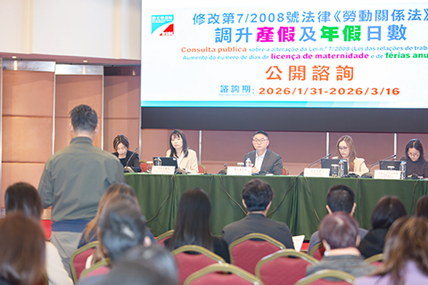 【特訊】修改第七/二00八號法律《勞動關係法》關於調升產假及年假日數的公眾諮詢期將於本月十六日結束。勞工事務局(下稱「勞工局」)已於本月七日舉行了第三場公眾諮詢會,當日出席人數約七十人,廣泛聽取社會各界對是次修法的意見和建議,並進行充份交流。