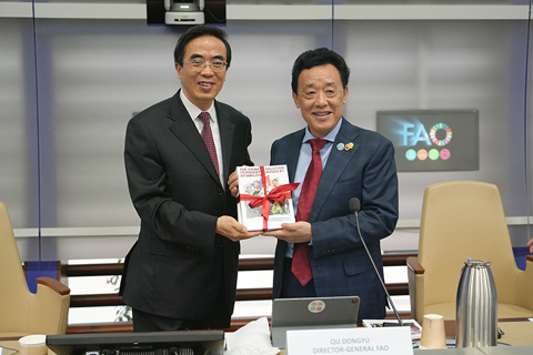 ◎ 三月十二日,二0二六年米蘭冬殘奧會期間,「共享發展權利──中國殘疾人減貧實踐分享會」在位於羅馬的聯合國糧農組織總部舉行。中國殘疾人聯合會(中國殘聯)主席、米蘭冬殘奧會中國代表團團長程凱和聯合國糧農組織總幹事屈冬玉出席會議並致辭。這是會議期間,程凱(左)代表中國殘聯向糧農組織贈送《破解因殘致貧的中國方案》一書的中英文版。(新華社記者 任耀庭 攝)