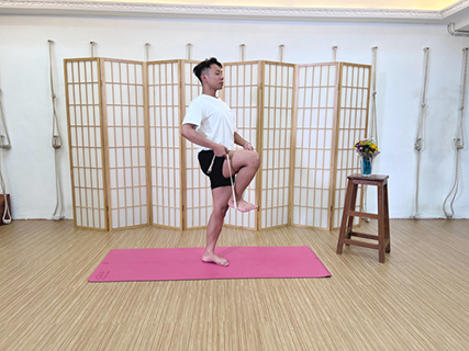 繼而最後一次提起右腿,同樣地要比上一次提更高,注意確保左腿能以單腳站穩,保持動作二十秒,之後換腳。換腳後,將伸展帶套在腳底,保持平衡或者向上提起單腿。[圖四]◇