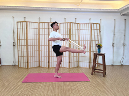 再次提起右腿,同樣地要比上一次提更高,注意確保左腿能以單腳站穩,保持動作二十秒,之後換腳。換腳後,將伸展帶套在腳底,令伸展腿作出比較安全的有支撐效果。[圖三]
