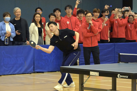 【香港中通社三月二十日電】(記者譚暢)中國國家隊乒乓球運動員、六面奧運金牌得主馬龍二十日現身香港理工大學,出席「體育的華麗蛻變:再創高峰」研討會,不但和學生對談,亦在之後的環節中切磋球技,引得現場歡呼聲陣陣。