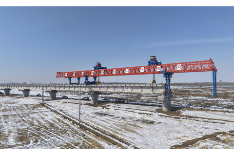 ◎ 這是三月二十日拍攝的佳木斯至同江鐵路擴能改造工程同江特大橋架樑施工現場(無人機照片)。當日,中歐班列「東通道」佳木斯至同江鐵路擴能改造工程同江特大橋正式復工架樑。佳同鐵路擴能改造工程西起佳木斯市東佳木斯站,終至同江北站,是一條以貨運為主、兼顧客運的幹線鐵路。此次復工架樑的同江特大橋位於同江至同江北改建段,橋樑全長一萬零四百卅五點一四米,採用單線T梁結構設計,是中歐班列「東通道」中口岸段最長新建橋樑。佳同鐵路擴能改造工程建成投用後,將全面提升中歐班列「東通道」之一的同江口岸後方通道能力,線路列車通過能力將提升三倍以上。(新華社記者王松 攝)