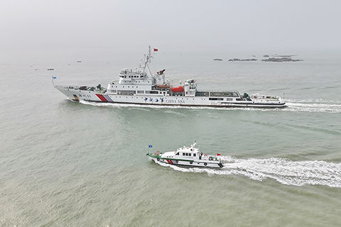 ◎ 三月二十三日,中國首艘巡航救助一體化船舶「海巡01」輪聯合泉州海事局、泉州出入境邊防檢查站以及東海航海保障中心廈門航標處等單位,在福建泉州沿海水域開展聯合巡航執法行動。(無人機照片)(中新社發 泉州海事局 供圖)