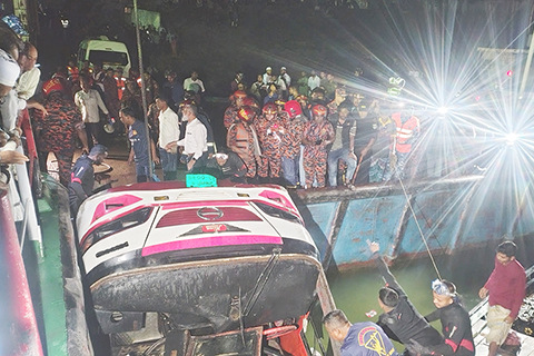 孟加拉國一大巴墜河至少23人死亡 2026-03-27 03:30:00 ◎ 孟加拉國媒體三月二十六日報道,一輛載有四十餘名乘客的大巴二十五日下午在該國中部拉傑巴里墜入帕德瑪河,造成至少二十三人死亡。圖為當日,救援人員在孟加拉國拉傑巴里展開搜救行動。(新華社發 哈比卜.拉赫曼 攝)