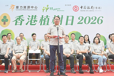 ◎ 三月廿八日,香港植樹日二0二六在西貢蕉坑舉行,約二千人共同種下五千棵本地樹苗。植樹日已第廿八年舉辦,以「美化香港、樹木樹人」為宗旨。圖為香港特區政府政務司司長陳國基出席活動並致辭。(香港中通社圖片)