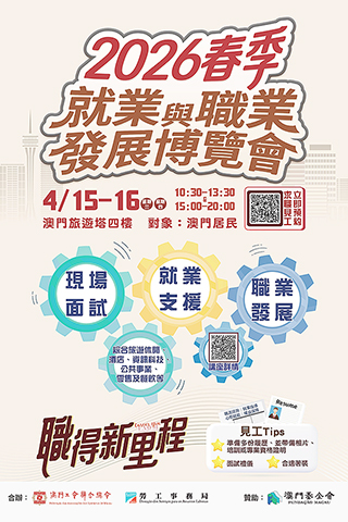 【特訊】為進一步促進本澳就業市場配對,協助居民拓展職涯發展,勞工事務局(下稱「勞工局」)與澳門工會聯合總會(下稱「工聯」)將於四月十五日至十六日一連兩日假澳門旅遊塔會展娛樂中心四樓合辦「二0二六春季就業與職業發展博覽會」(下稱「博覽會」)。有意參加的澳門居民,可由今(三十一)日起至四月十三日期間進行網上預約。
