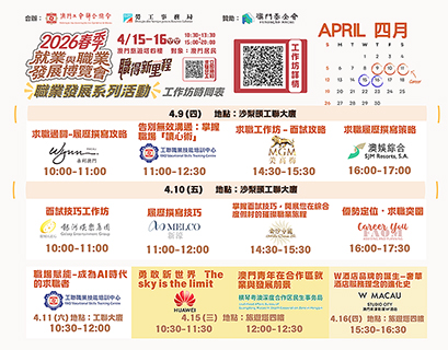 博覽會於四月十五日及十六日(星期三及星期四)假澳門旅遊塔會展娛樂中心四樓舉行,每日設兩個開放時段:上午十時半至下午一時半、下午三時至晚上八時。有意參加的本澳居民,可由今(三十一)日起至四月十三日期間,登入勞工局網站活動專頁:https://www.dsal.gov.mo/zh_tw/standard/spring_jobfair2026.html報名,名額有限,有意者宜盡早預約。參加職業發展系列活動的人士,可留意各場次的報名截止日期及舉行日期,並按時出席。