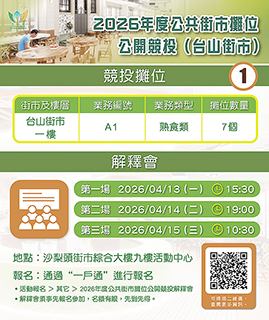 為了讓有意投標者更好地瞭解相關程序、正確填寫公開競投申請表、撰寫競投計劃書應注意事項,市政署分別於4月13日下午3時30分、4月14日晚上7時正,以及4月15日上午10時30分,在沙梨頭街市九樓活動中心舉行三場公開競投解釋會,有意投標者可以通過“一戶通”報名預約參加。此外,市民如有查詢可致電街市事務處熱線:28483933,亦可瀏覽市政署網站公共街市攤位公開競投頁面(https://go.iam.gov.mo/fwlink/concursomercado)獲取更詳細資訊。