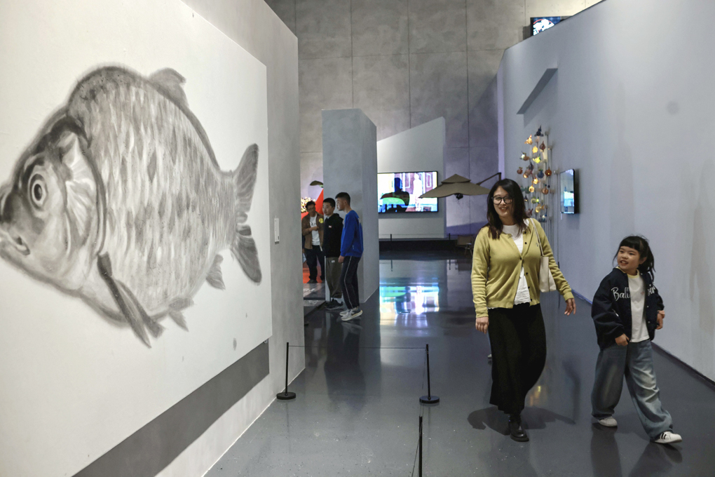◎ 四月二日,成都市中小學春假第二天,不少家長帶著學生走進成都市美術館觀展研學,與孩子一起在藝術的殿堂裡共享春假時光。圖為家長和孩子觀看繪畫作品《鯉》。(中新社記者 王磊 攝)