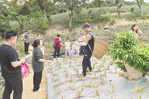 下午,隊伍轉戰神灣鳳梨非遺文化園。作為中山百年僑果,神灣鳳梨承載著華僑回鄉創業的奮鬥故事。在種植場,農技專家現場講解鳳梨「空中種植」的獨特技藝──利用丫髻山特殊地形與氣候,鳳梨沿山坡階梯式栽種,形成「金山」奇觀。孩子們手持竹籃體驗採摘,學習辨別成熟鳳梨的技巧。「第一次知道鳳梨背後有這麼多故事!「鳳梨文化小課堂」,通過圖片與實物展示,講述神灣鳳梨從秘魯引入、紮根中山的百年歷程,詮釋「僑果」背後的華僑精神。