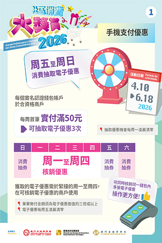 為方便消費者識別及使用電子優惠,經科局正陸續在全澳逾2萬間可核銷電子優惠的商戶張貼活動海報及派發活動座枱卡。市民如欲了解活動詳情,可瀏覽「2026社區消費大獎賞」活動專頁(https://www.macaospendingrewards.com/)、或致電熱線電話28575472及28575439(服務時間為周一至周日上午9時至下午1時及下午2時30分至6時)查詢。