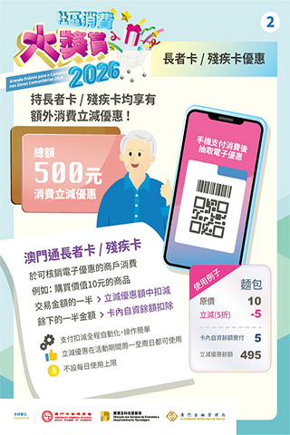 本澳即將進入風雨季節,天氣變化頻繁,本次消費立減優惠使用期(4月10日至6月18日)充裕,經科局與社工局呼籲長者及持殘評證人士應在確保出行安全的前提下,選擇合適時段前往服務地點辦理相關申領手續。◇