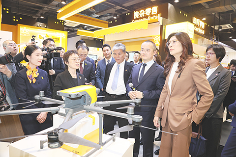 ◎ 四月八日下午,中國國民黨主席鄭麗文一行在上海參觀美團公司總部。圖為鄭麗文(右一)在美團創始人兼董事長王興(右二)的陪同下,參觀美團送餐無人機。(中新社發 鍾欣攝)
