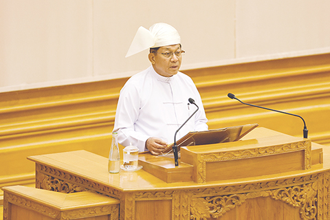 ◎ 緬甸新總統敏昂萊四月十日在位於首都內比都的聯邦議會宣誓就職,開啟為期五年的任期。新當選的副總統紐梭、南尼尼埃,以及新一屆聯邦政府部長、各聯邦機構負責人同日宣誓就職。圖為當日,在緬甸內比都,緬甸新總統敏昂萊宣誓就職後致辭。(新華社發 苗覺梭 攝)
