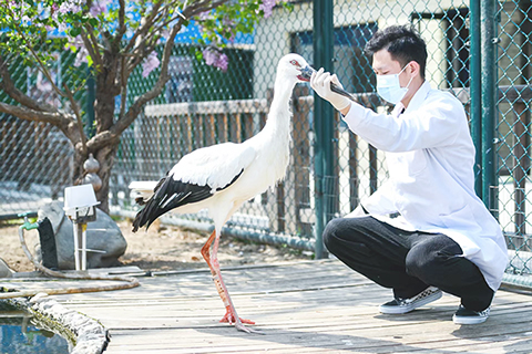 東方白鸛屬大型涉禽,被譽為「鳥中國寶」。二零二四年七月,救護中心接收這隻東方白鸛時,發現其已無法站立,後確認其一側腳部嚴重壞死,只能截除。