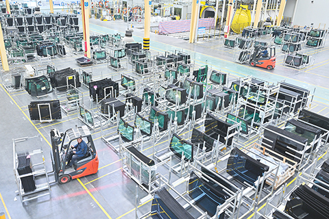 ◎ 四月十三日,「牢記囑托開新局日新江淮往前趕」採訪團走進位於合肥市肥西縣的福耀集團全產業鏈生產基地,探訪汽車玻璃的智能製造過程。如今,汽車玻璃除了遮風擋雨的功能外,還可以用於投影、通信、觸控等。圖為員工在成品庫運送汽車玻璃成品。(中新社)