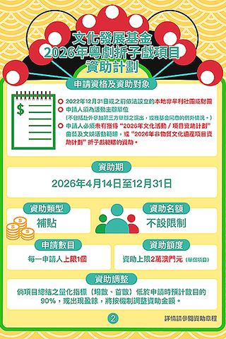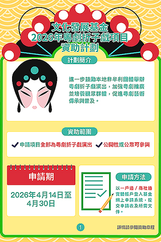 【特訊】為回應社會對粵劇文化活動的需求,文化發展基金推出「二0二六年粵劇折子戲項目資助計劃」,申請期由二0二六年四月十四日至四月三十日。