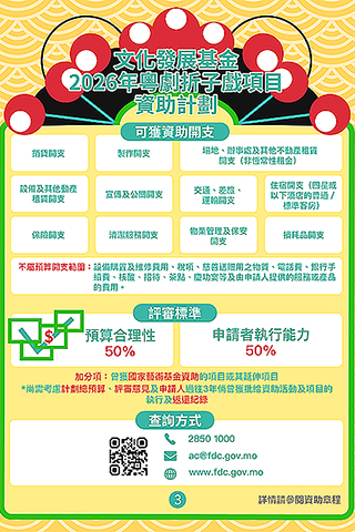 如對資助申請有任何疑問,請致電二八五0一000或電郵ac@fdc.gov.mo向資助管理處查詢。◇