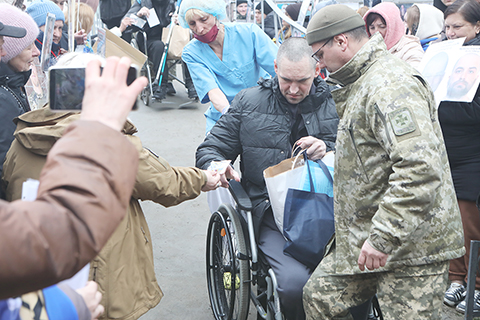 ◎ 四月十一日,在烏克蘭北部邊境地區,被釋放的烏克蘭戰俘被送往醫院接受進一步治療。俄羅斯國防部當日發佈消息說,當天一百七十五名俄羅斯戰俘從烏克蘭方面控制區被遣返。作為交換,一百七十五名烏方戰俘被遣返。俄國防部通過社交媒體表示,上述被遣返的俄軍人目前位於白俄羅斯境內,他們已得到必要的醫療和心理救助。隨後這些軍人將被送入俄境內的軍方醫療機構接受康復治療。俄國防部還說,另有七名此前被烏方扣留的俄公民也於當日獲釋。烏克蘭總統澤連斯基當天在社交媒體發佈消息說,烏方被俄方扣押的一百七十五名軍人、七名平民返回家園。這批軍人中多數自二0二二年起被扣押。(新華社發 彼得.德魯克 攝)
