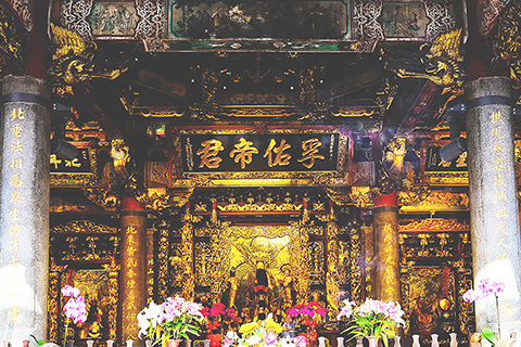 台灣新北市汐止區拱北殿,是著名的百年古剎,建於清光緒廿七年(西元一九0一年),俗稱汐止仙公廟,初為一座木造建築,後拆除重建,主祀道教全真派祖師呂純陽真人,也就是八仙當中的「孚佑帝君」呂洞賓。廟宇內環境清幽,沿途山林靜謐草木扶疏,楓樹將山頭染紅之際更是美不勝收,而廟前雙拱橋更是造型優美、古樸雅致,有眾星拱北辰之意。圖為正殿前石雕佛像,法相莊嚴慈祥,建築更展現廟宇之美,散發宗教文化的莊嚴氛圍。(香港中通社圖片)