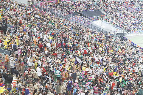【香港中通社四月十八日電】(記者 徐嘉儀)為期三天的香港國際七人欖球賽十八日踏入第二天賽程,不少球迷一早盛裝打扮前往啟德體育園,投入年度最狂熱的「七欖派對」。現場人潮湧湧,截至下午二時四十五分,主場館南看台及二樓觀賽區人數已達上限。